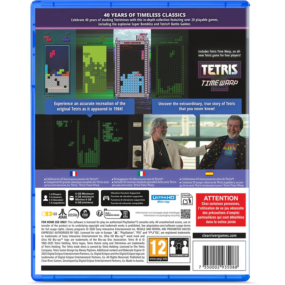 Retrouvez plus de 15 classiques jouables qui ont marqué l'histoire de la franchise, dont la plupart sortent pour la première fois des frontières du Japon. Affrontez vos amis dans le cultissime jeu multijoueur Tetris Battle Gaiden, créez des explosions massives pour faire disparaître les lignes dans Super Bombliss et retournez en 1984, à l'aube d'un titre légendaire, grâce à une reproduction fidèle de la première version de Tetris sur un Electronika 60.