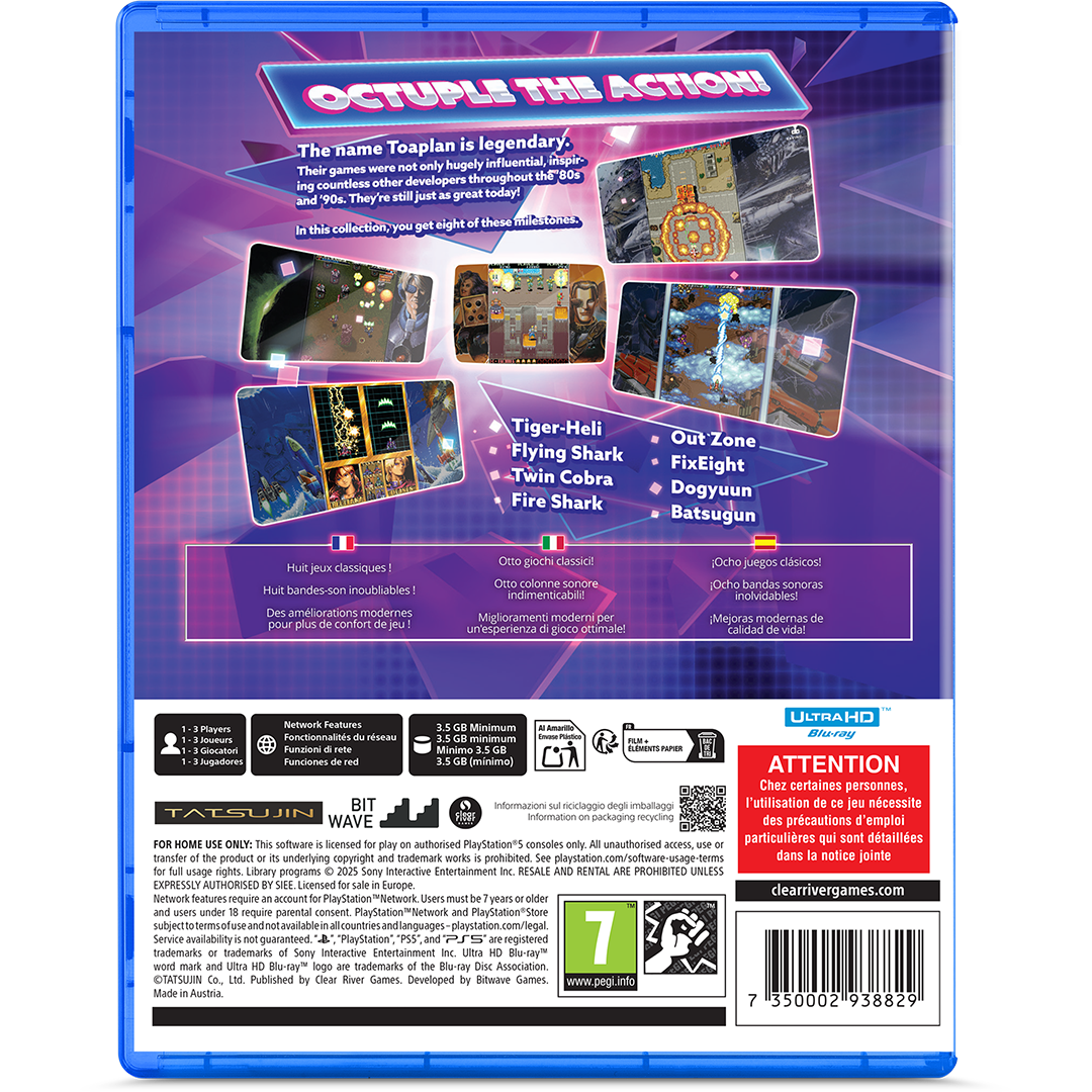 Cette collection comprend Tiger-Heli, Flying Shark, Twin Cobra, Fire Shark, Out Zone, FixEight, Dogyuun, et Batsugun. Huit fois plus d'action et mille fois plus de plaisir pour vous replonger dans l'ambiance néon des salles d'arcade d'antan !