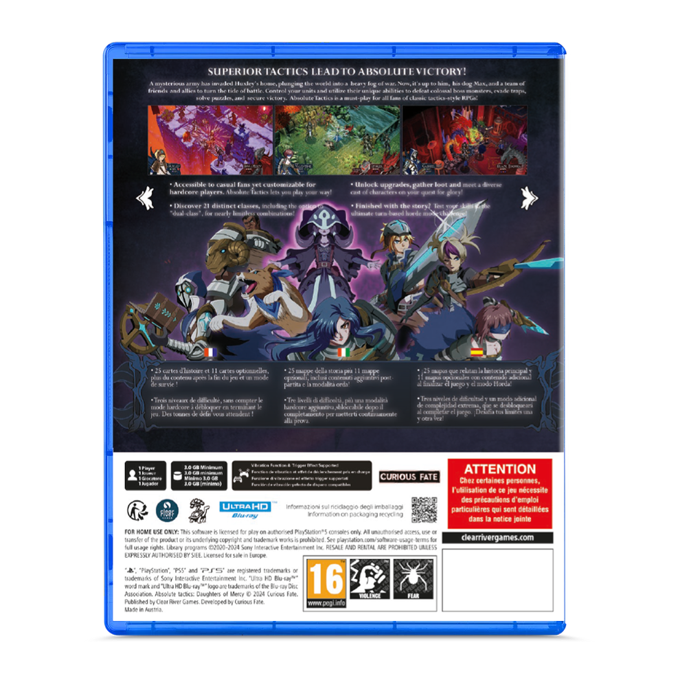 Absolute Tactics: Daughters of Mercy è una scanzonata avventura RPG a turni che dà un tocco moderno ai classici giochi in stile tattico. Con un variegato cast di personaggi, enormi mostri boss e un oscuro mondo in guerra, Absolute Tactics proietta i giocatori nel bel mezzo dell'azione, dove il nostro eroe Huxley e il suo cane Max stanno formando una squadra di alleati per difendere la loro casa da un misterioso esercito invasore.