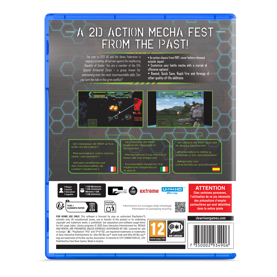 Assault Suit Leynos 2 è il sequel in 32 bit del gioco del 1990 Assault Suit Leynos (conosciuto come Target Earth negli Stati Uniti) per Sega Mega Drive/Genesis. È uno sparatutto a scorrimento laterale in cui i giocatori pilotano armature d'assalto Leynos contro un esercito robotico implacabile, con una storia intensa e un gameplay ispirato agli anime mecha. Assault Suit Leynos ha dato vita al celebre spin-off Assault Suit Valken (conosciuto come Cybernator), ambientato nello stesso universo. Pubblicato per Super NES™ nel 1992, è un gioco imperdibile per ogni appassionato di azione robotica in 2D!