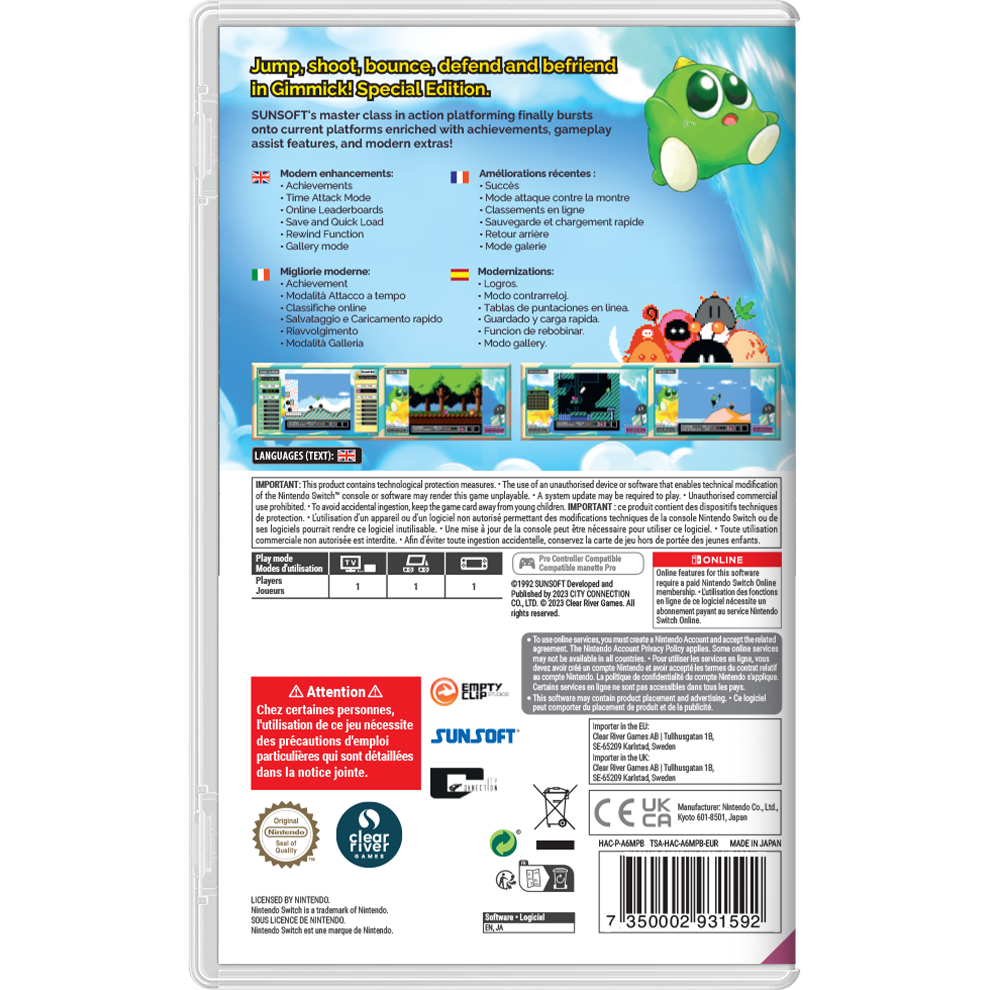 Jump, shoot, bounce, defend and befriend in Gimmick! Special Edition. SUNSOFT's master class in action platforming finally bursts onto current platforms enriched with achievements, gameplay assist features, and modern extras!